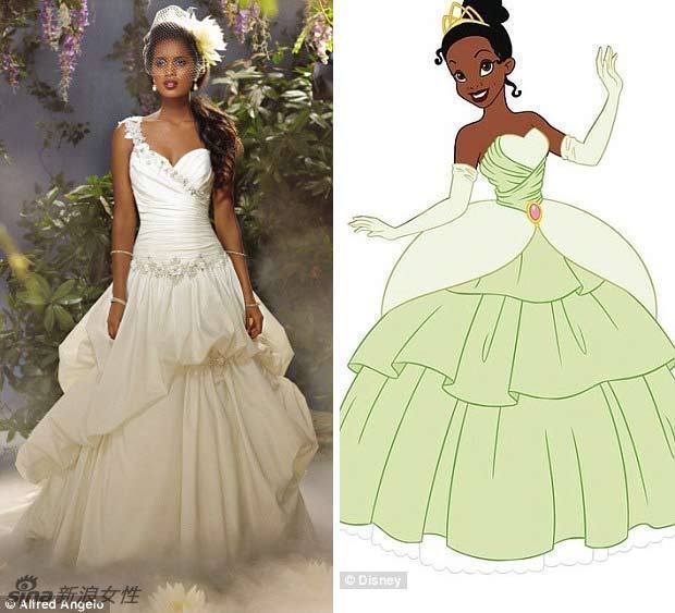 貝兒公主(Belle)婚紗(左):根據(jù)動(dòng)畫片《美女與野獸》中貝兒公主所穿的黃色禮服打造。近日,美國(guó)迪士尼公司與著名婚紗品牌Alfred Angelo合作推出一系列童話婚紗。這些婚紗都取材于迪士尼的經(jīng)典童話作品,每套售價(jià)在599英鎊至1199英鎊之間。